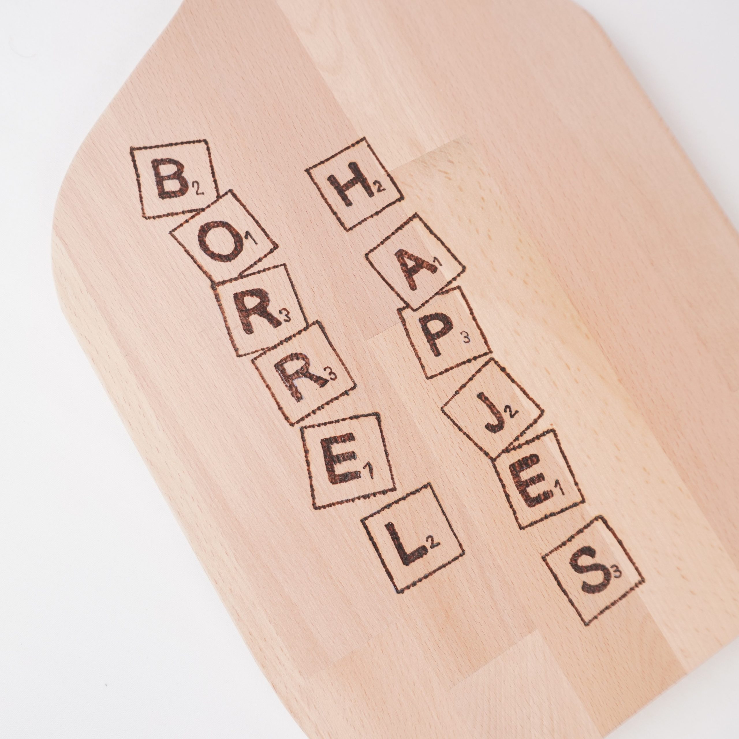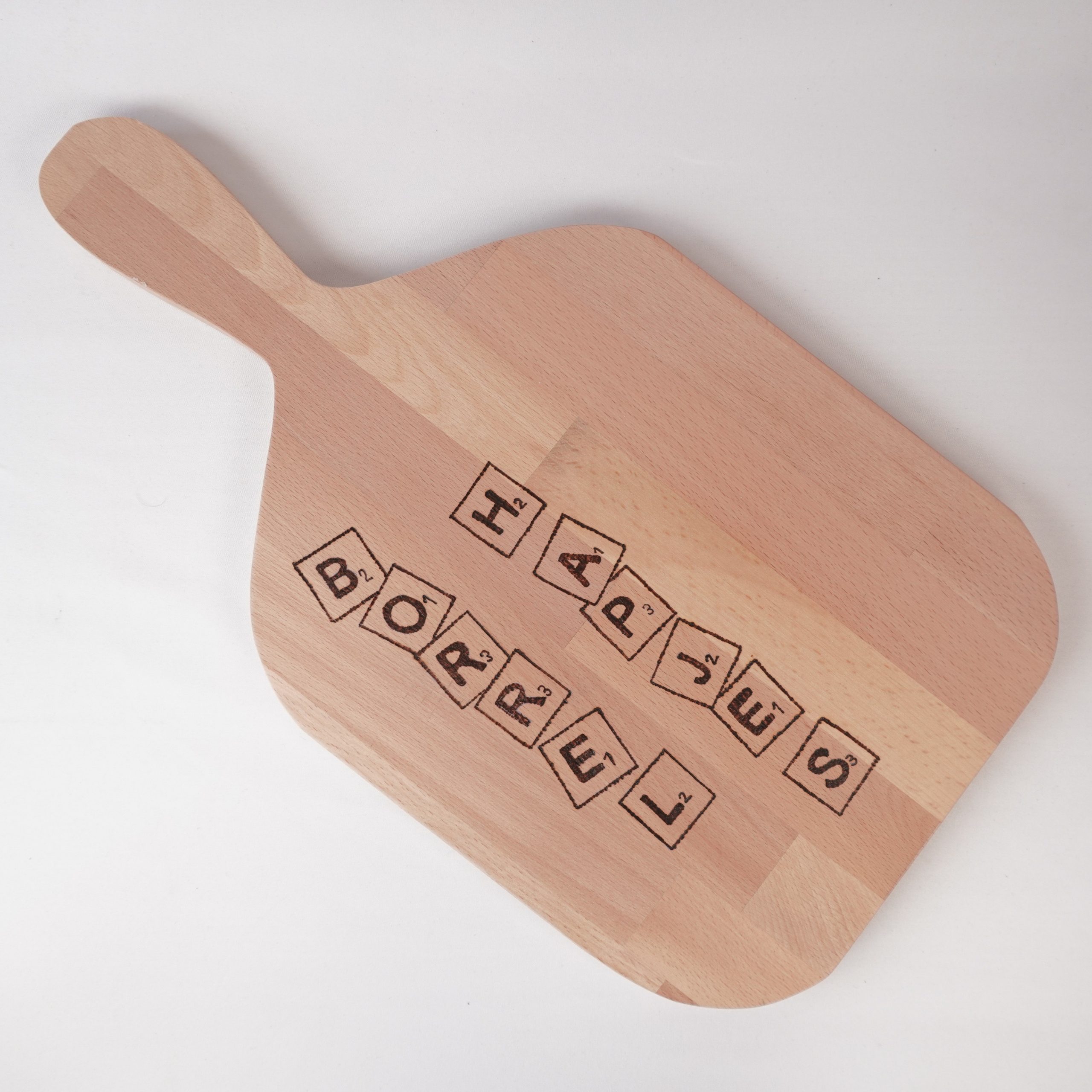 Op de borrelplank is met de hand een afbeelding gebrand.
