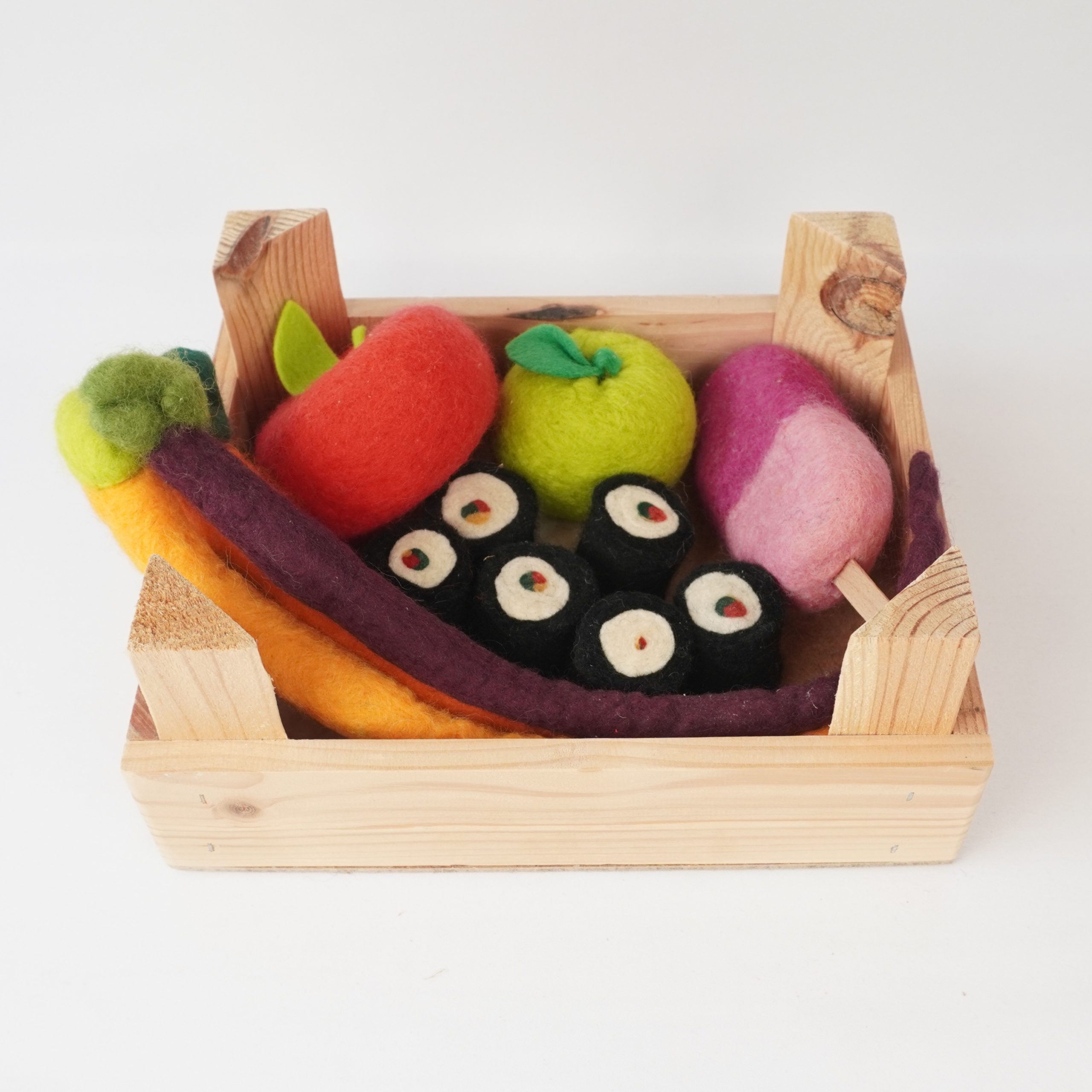 De etenswaren zitten mooi verpakt in een houten kistje.