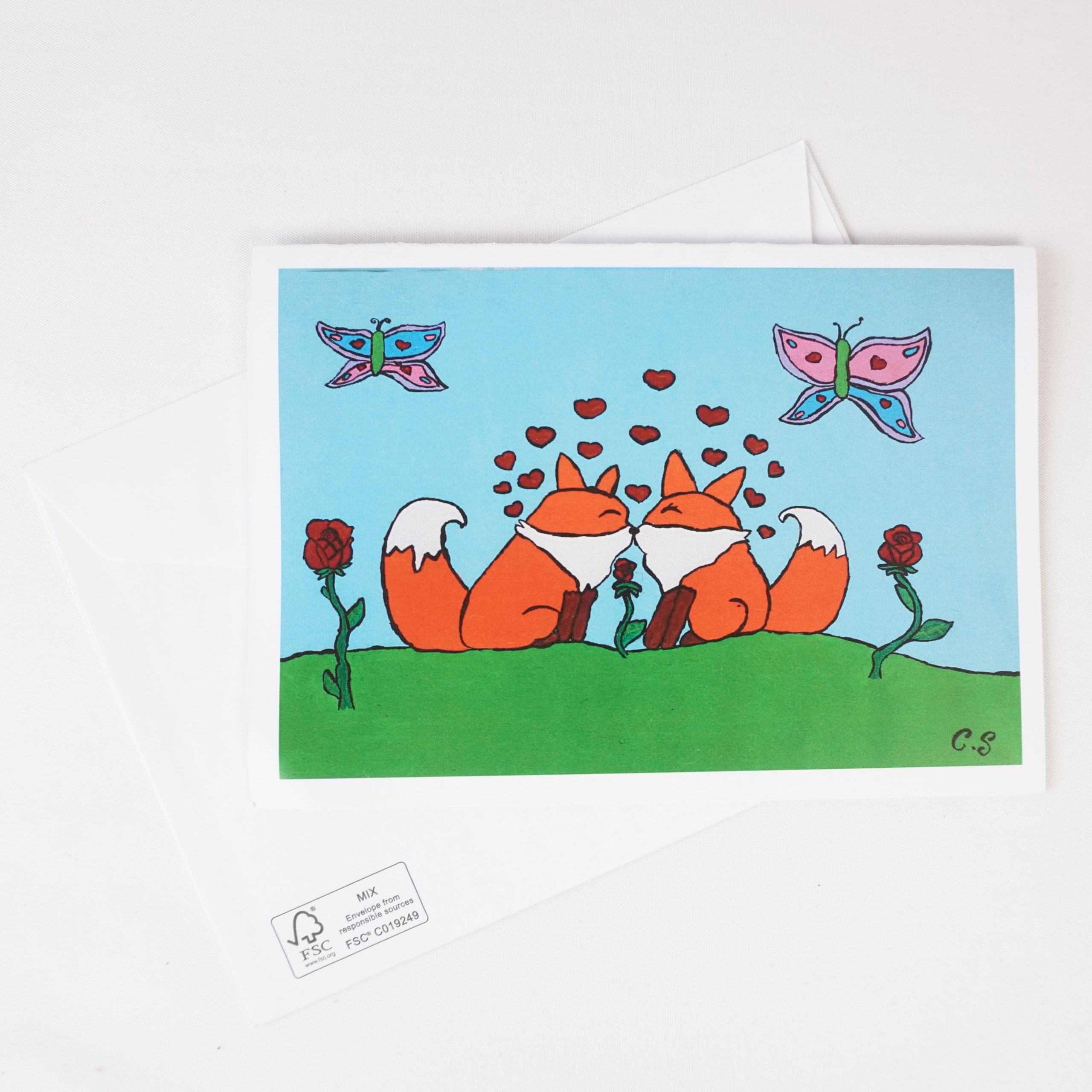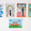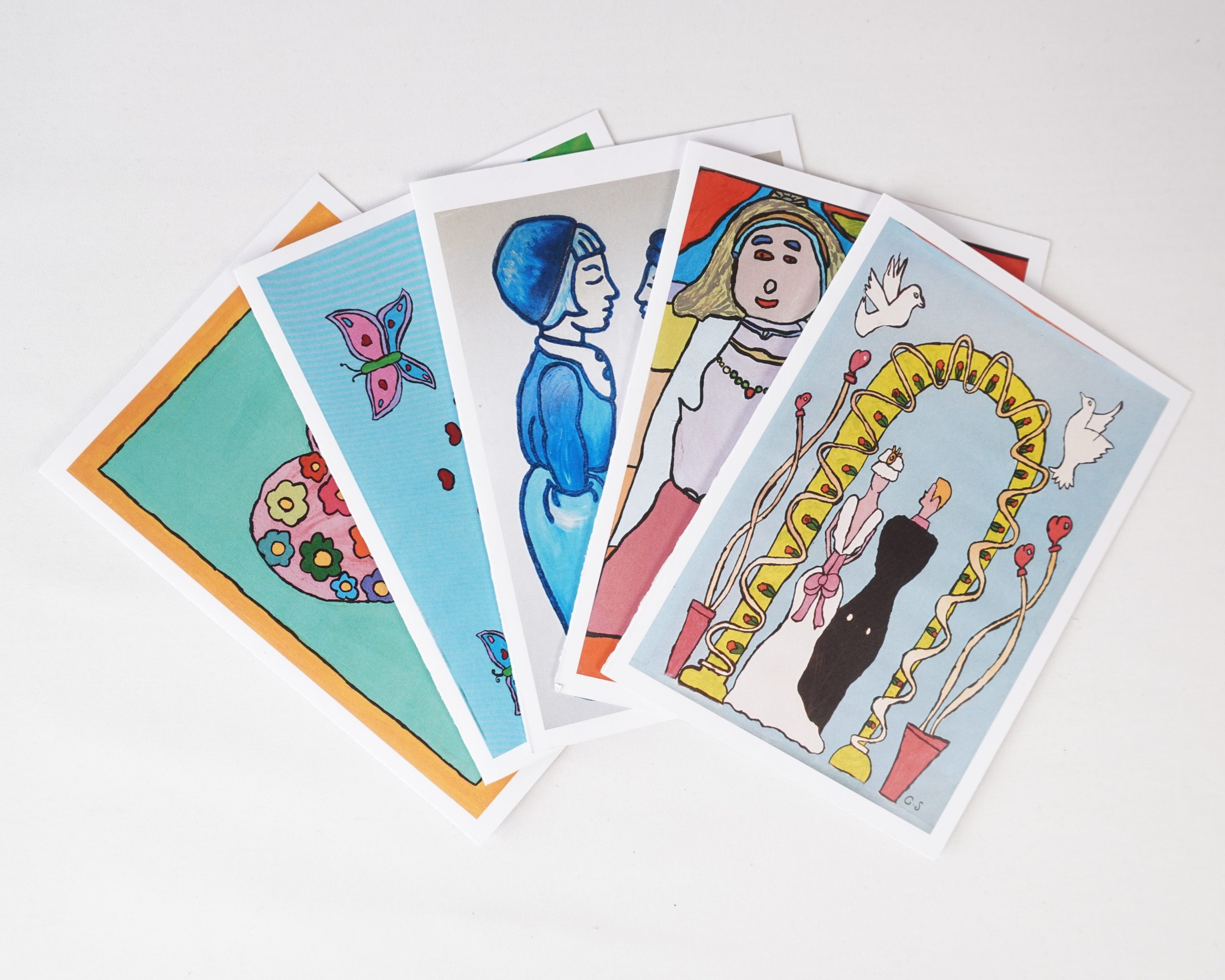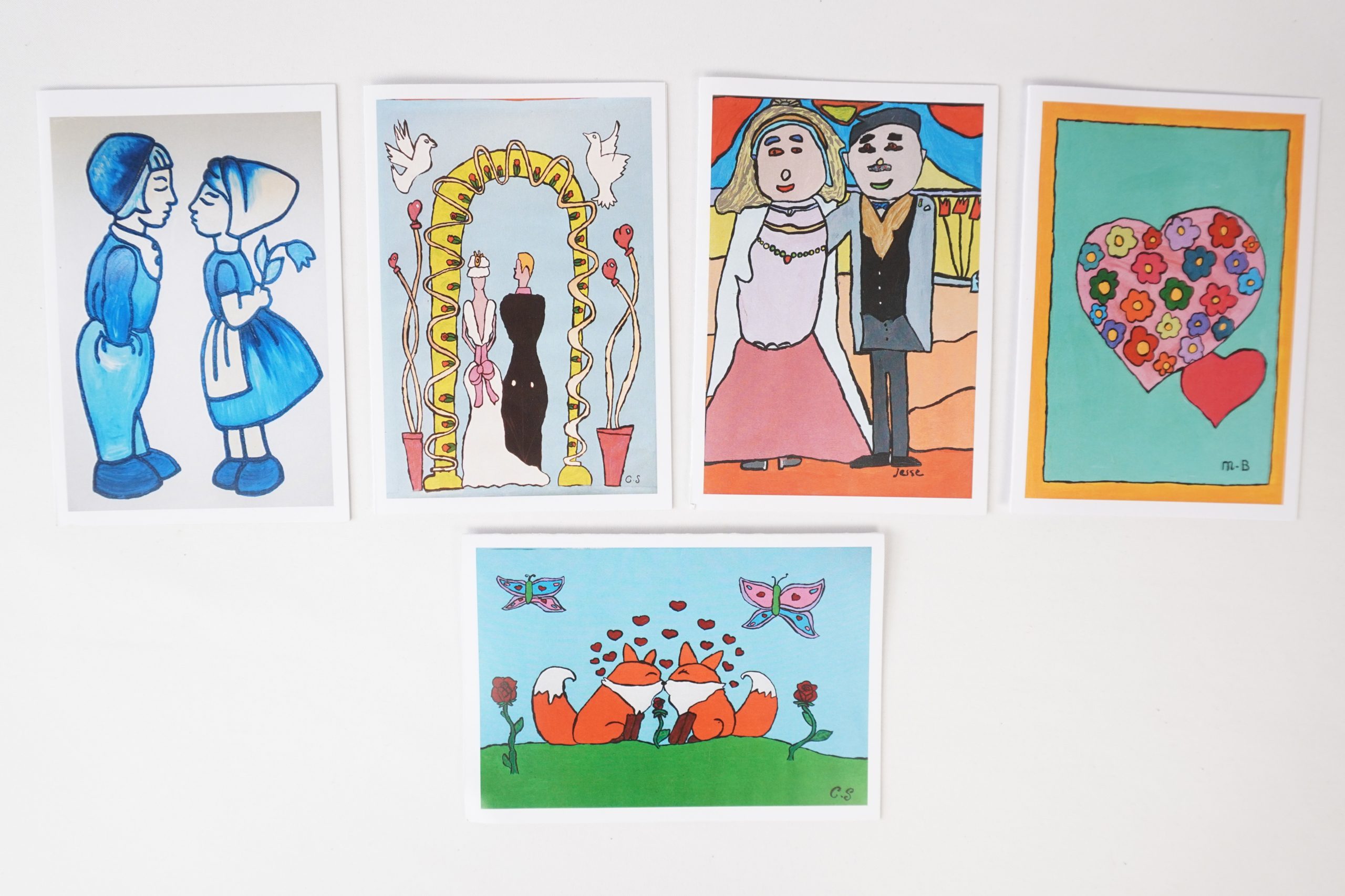 Op wenskaarten staan professionele foto’s van schilderijen van kunstenaars van Ipse de Bruggen. Ze zijn gevouwen met een rilapparaat, waardoor de kaarten er perfect uitzien. Iedere kaart is een kunstwerk op zich. De set bestaat uit vijf verschillende kaarten met hetzelfde thema. Inclusief enveloppen.