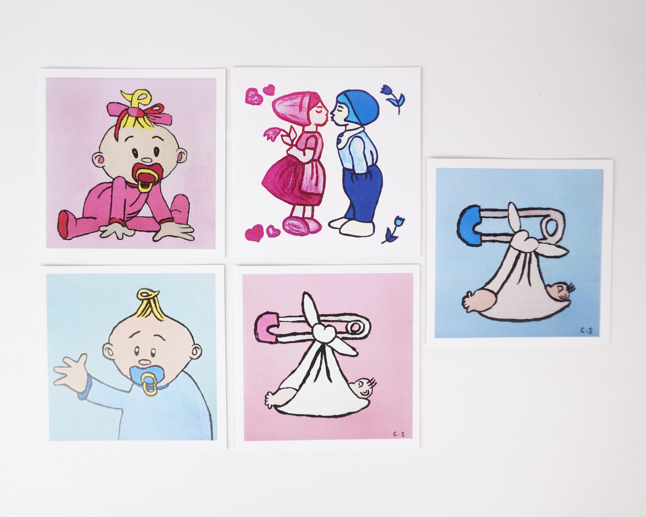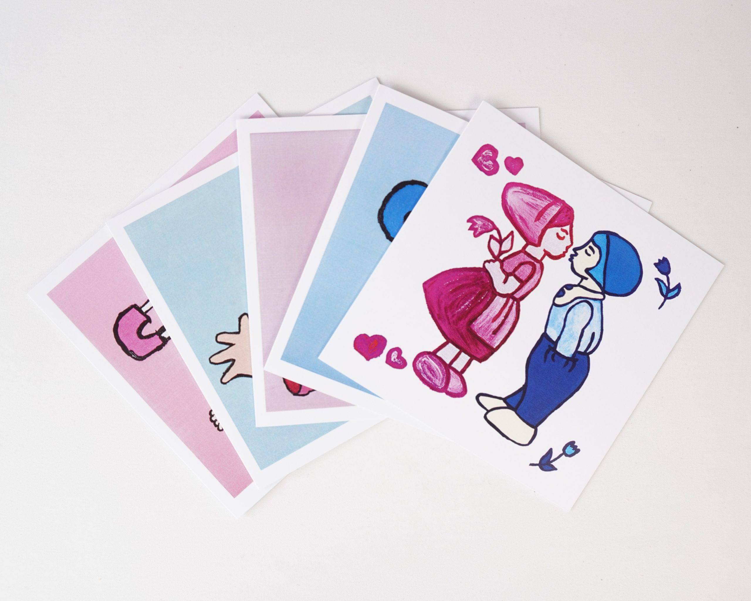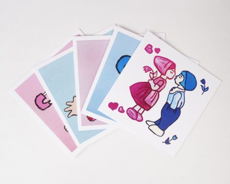 Op wenskaarten staan professionele foto’s van schilderijen van kunstenaars van Ipse de Bruggen. Ze zijn gevouwen met een rilapparaat, waardoor de kaarten er perfect uitzien. Iedere kaart is een kunstwerk op zich. De set bestaat uit vijf verschillende kaarten met hetzelfde thema. Inclusief enveloppen.