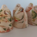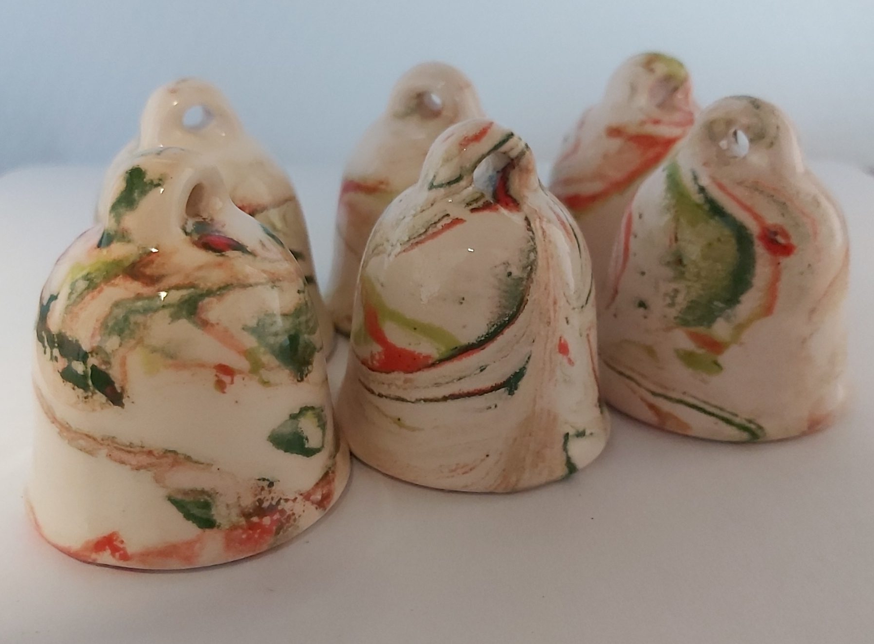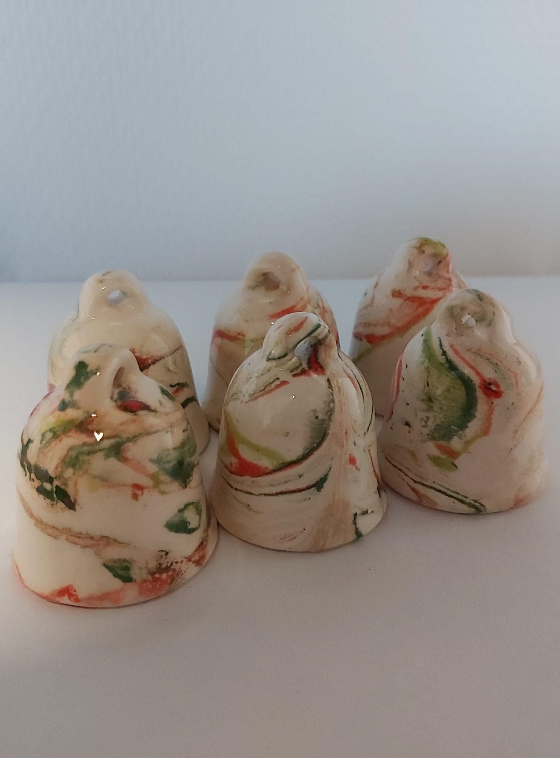 De 6 kerstklokjes zijn geglazuurd in de kleuren rood en 2 tinten groen.