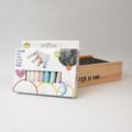 Kistje voorzien van een doosje met 24 gekleurde krijtjes en een sponsje.