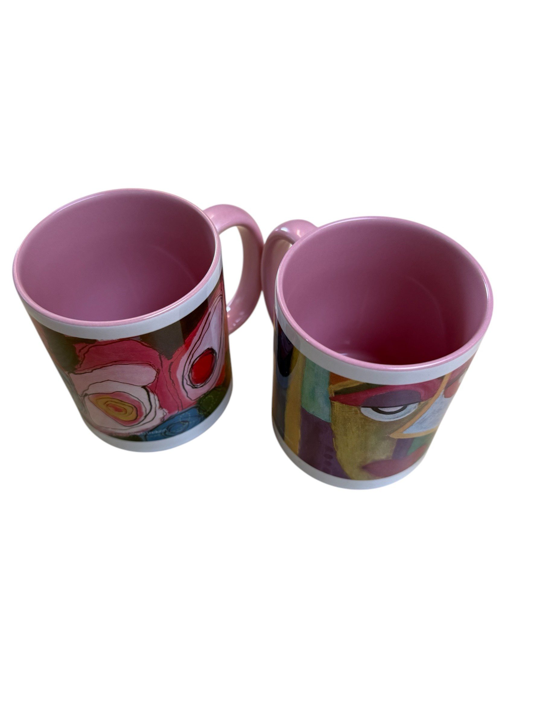 De bekers zijn gemaakt van stevig keramiek, wat ze zowel praktisch als duurzaam maakt voor dagelijks gebruik. Ze zijn rondom bedrukt. De binnenkant en het oor hebben een roze kleur.