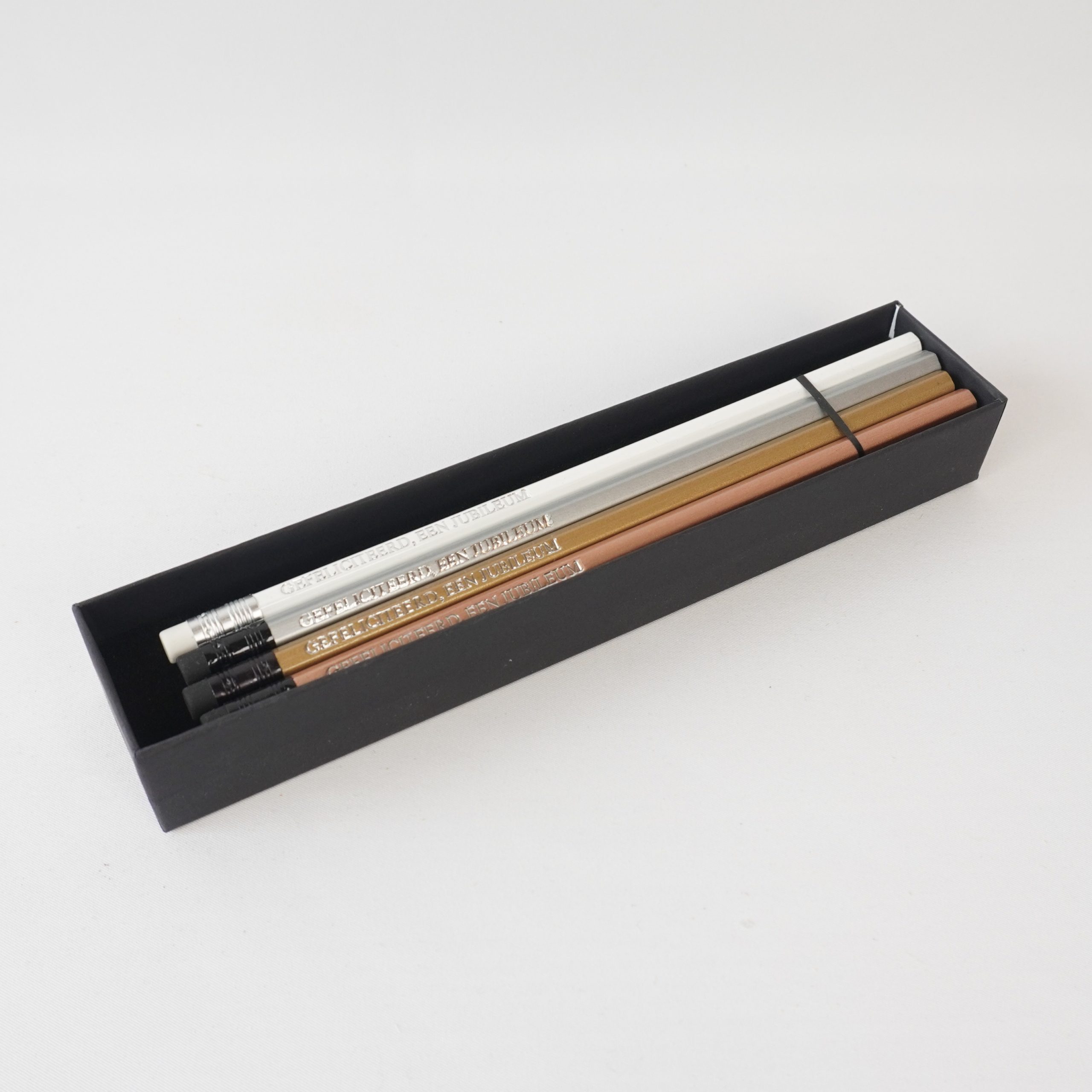 Omdat het een handmatig proces is worden alle handelingen door onze cliënten zelfstandig uitgevoerd, van het “zetten” van de letters in de mal (van achter naar voren) naar het bedrukken en het verpakken van de potloden.