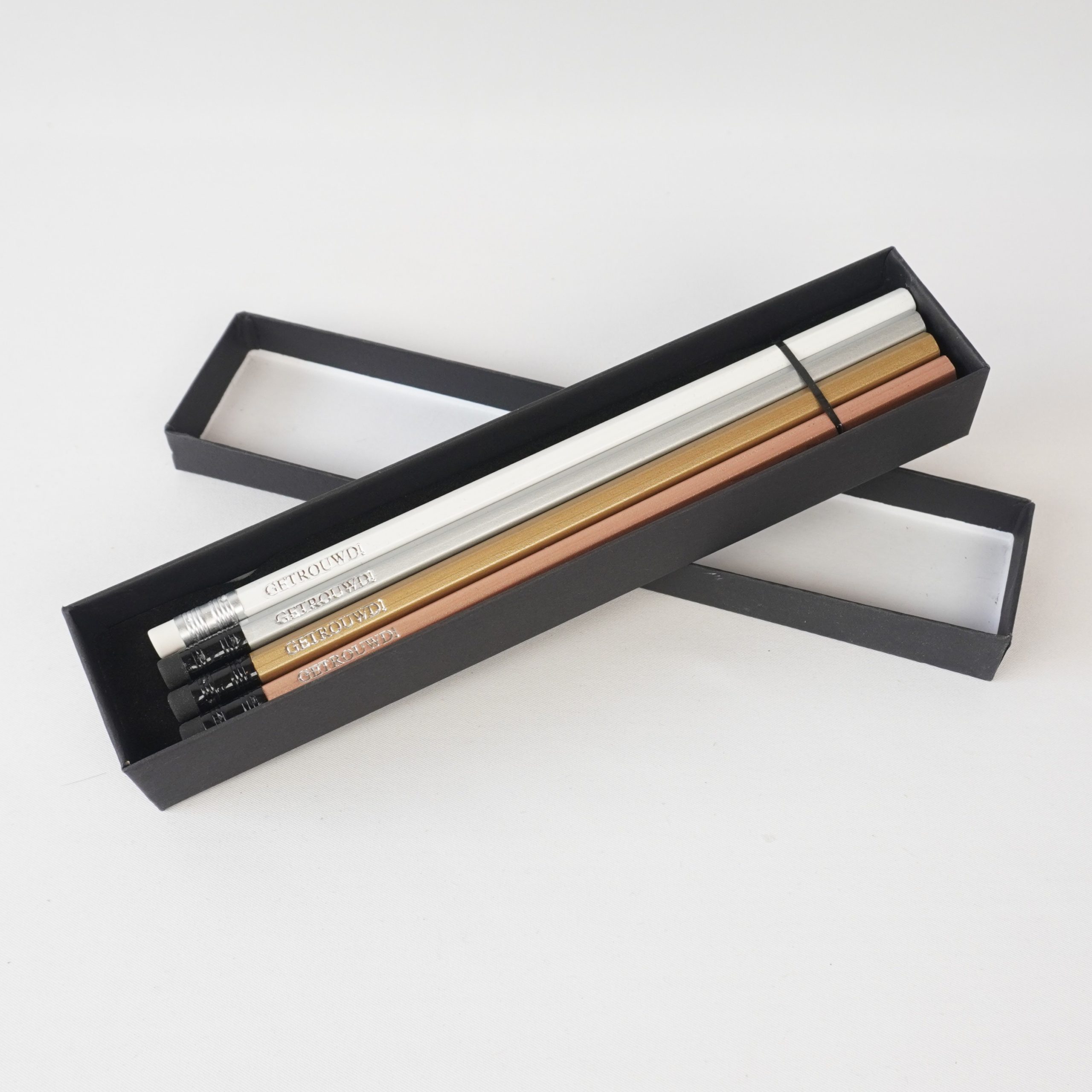 Omdat het een handmatig proces is worden alle handelingen door onze cliënten zelfstandig uitgevoerd, van het “zetten” van de letters in de mal (van achter naar voren) naar het bedrukken en het verpakken van de potloden.