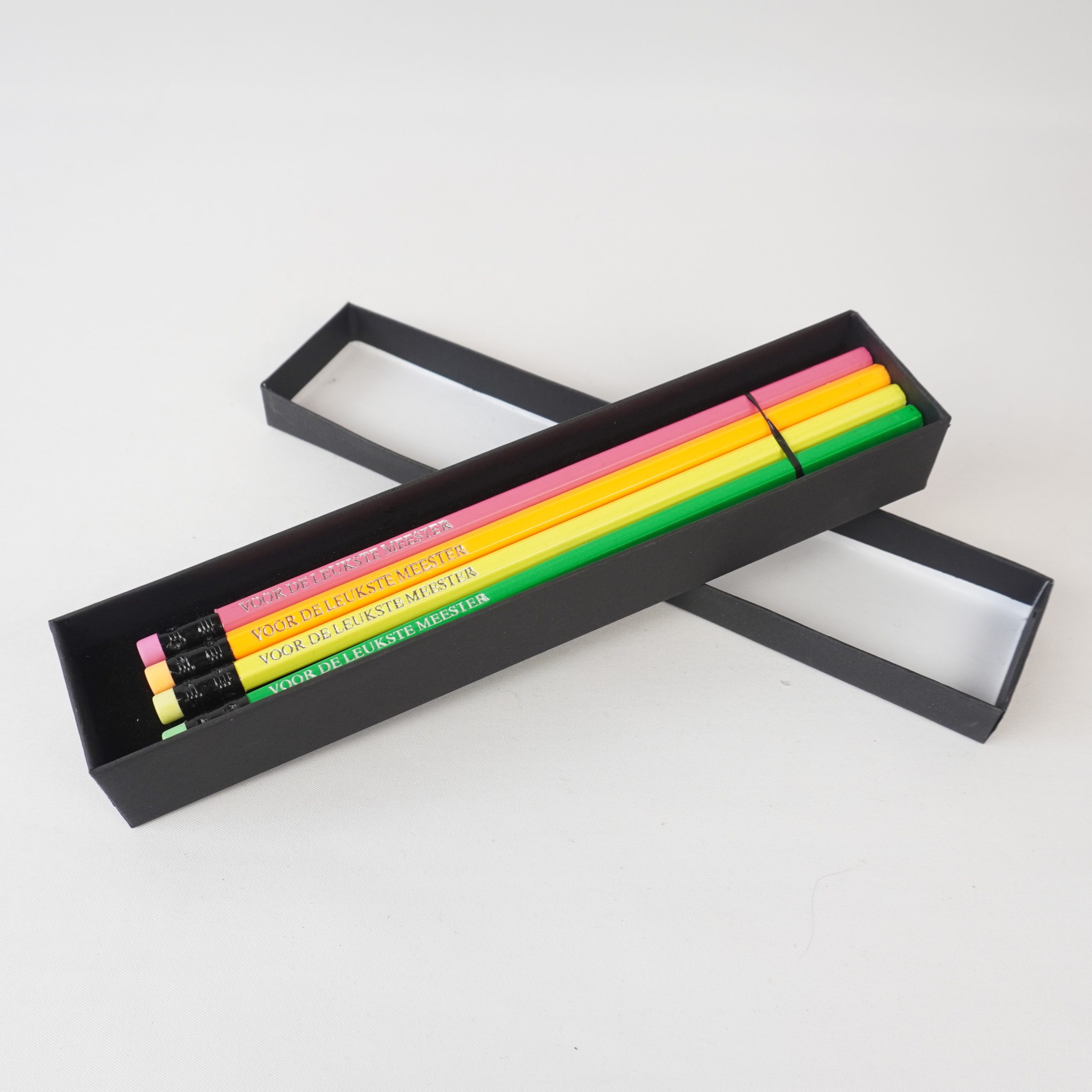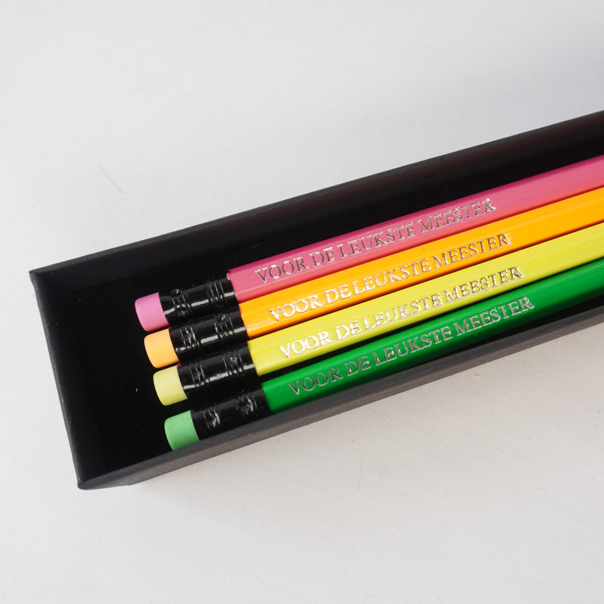 Omdat het een handmatig proces is worden alle handelingen door onze cliënten zelfstandig uitgevoerd, van het “zetten” van de letters in de mal (van achter naar voren) naar het bedrukken en het verpakken van de potloden.