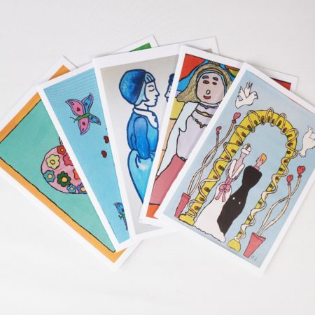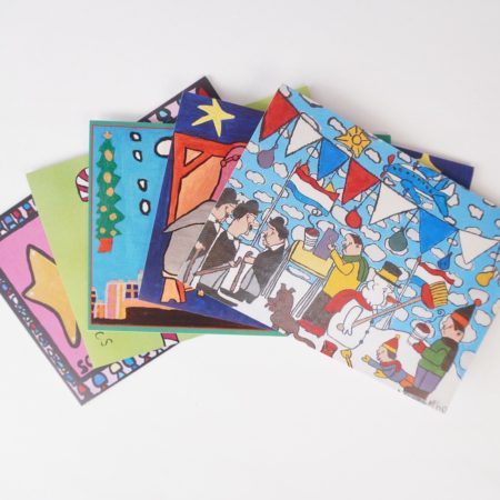 Op wenskaarten staan professionele foto’s van schilderijen van kunstenaars van Ipse de Bruggen. Ze zijn gevouwen met een rilapparaat, waardoor de kaarten er perfect uitzien. Iedere kaart is een kunstwerk op zich. De set bestaat uit vijf verschillende kaarten met hetzelfde thema. Inclusief enveloppen.