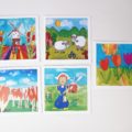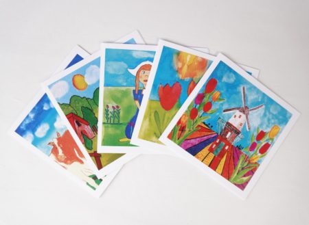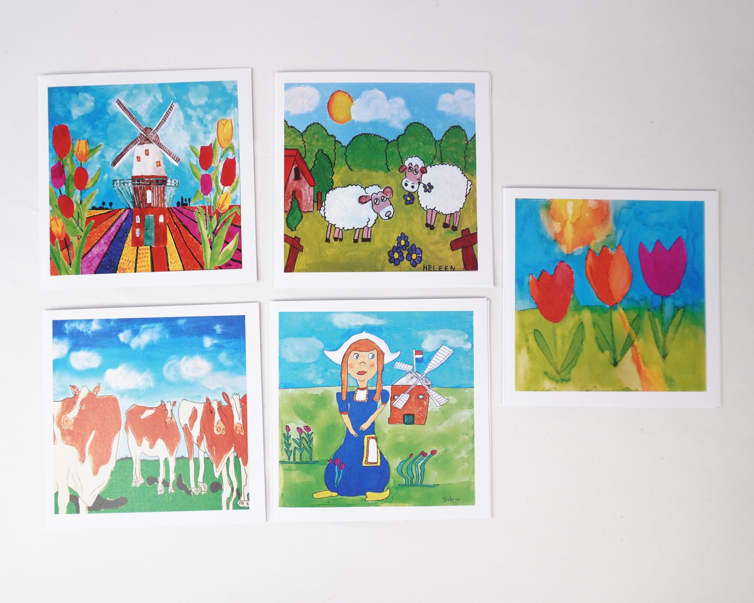 Op wenskaarten staan professionele foto’s van schilderijen van kunstenaars van Ipse de Bruggen. Ze zijn gevouwen met een rilapparaat, waardoor de kaarten er perfect uitzien. Iedere kaart is een kunstwerk op zich. De set bestaat uit vijf verschillende kaarten met hetzelfde thema. Inclusief enveloppen.