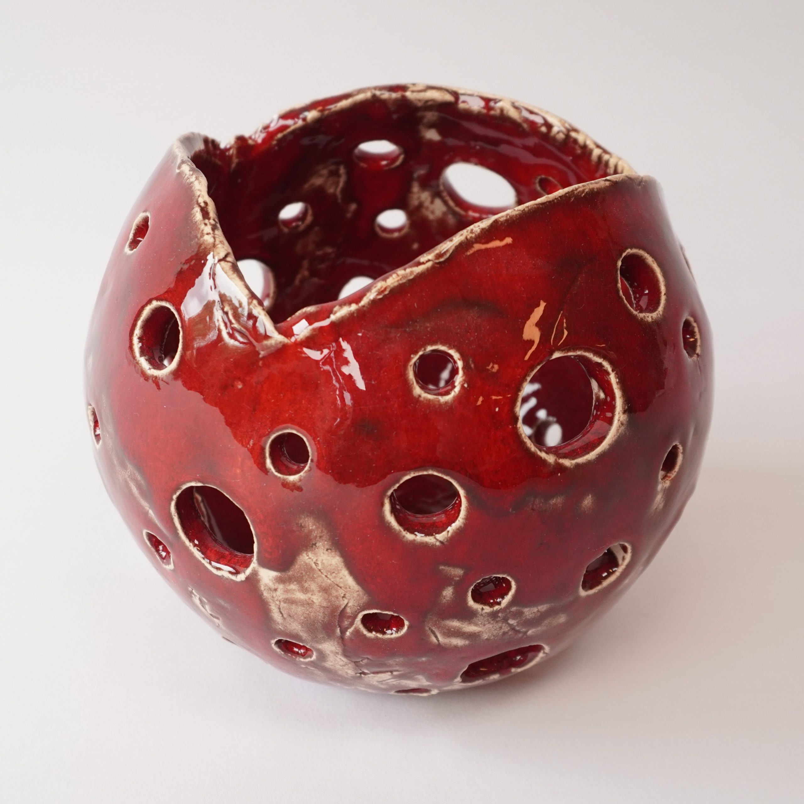 Handgemaakte bol van keramiek met een patroon van gaten, afgewerkt met een glazuurlaag.